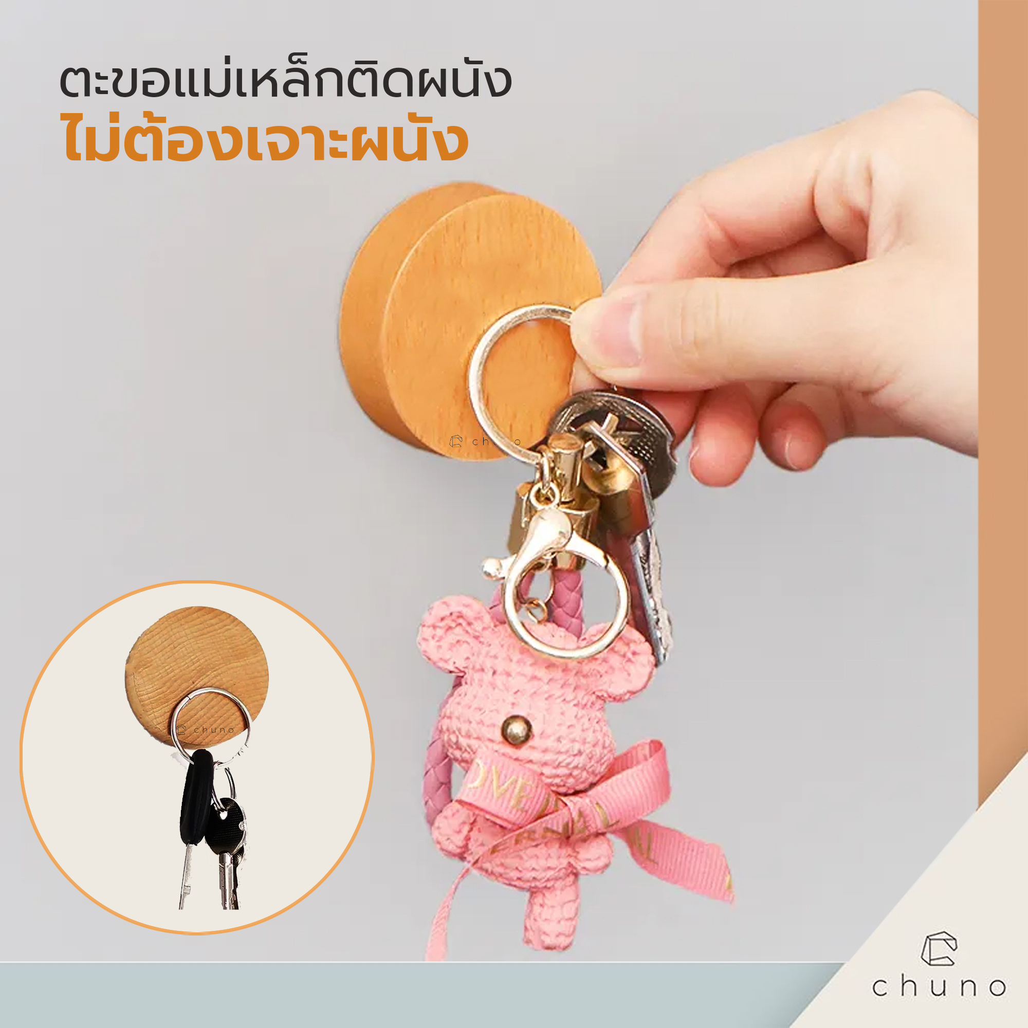 ตะขอแม่เหล็กสุดชิค Chuno สามารถติดผนังได้แบบไม่ต้องเจาะผนัง มีกาว 2 หน้าติดไปให้เรียบร้อย แกะแปะใช้งานได้เลย หรือจะติดกับตู้เย็นก็ได้นะ เหมาะสำหรับใช้ดูดเก็บกุญแจหรืออื่นๆ สะดวกสบายจะติดที่กระจก หรือตู้เย็นก็ได้ ทำจากไม้บีชแท้สวยๆ