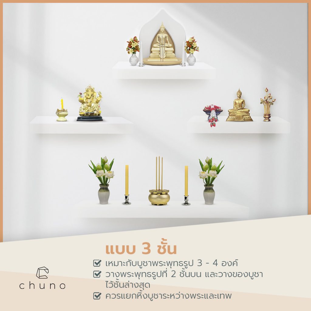 วางพระพุทธรูปที่ 2 ชั้นบน และวางของบูชาไว้ชั้นล่างสุด